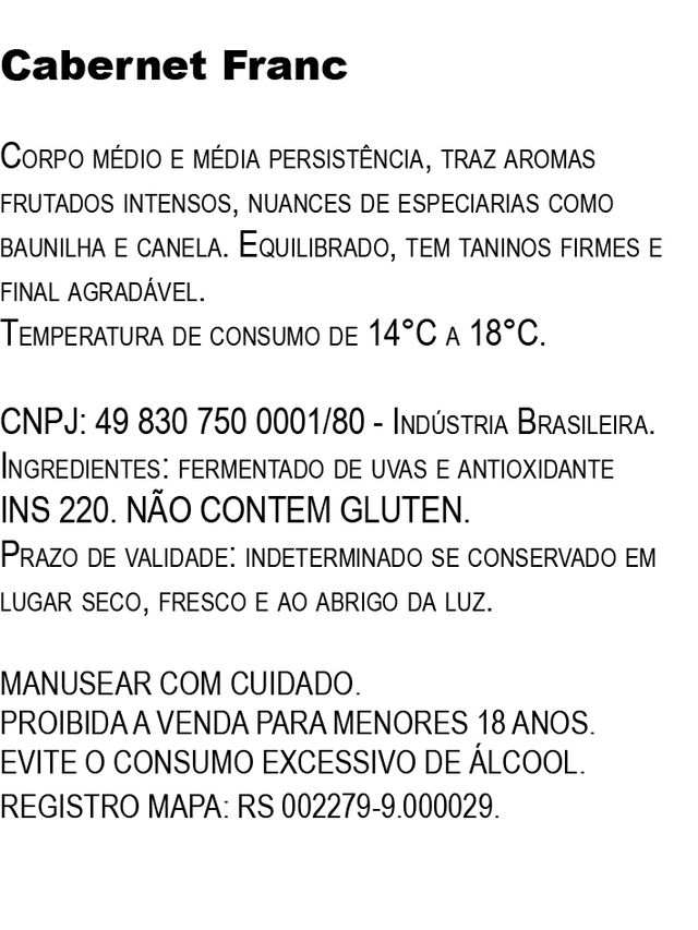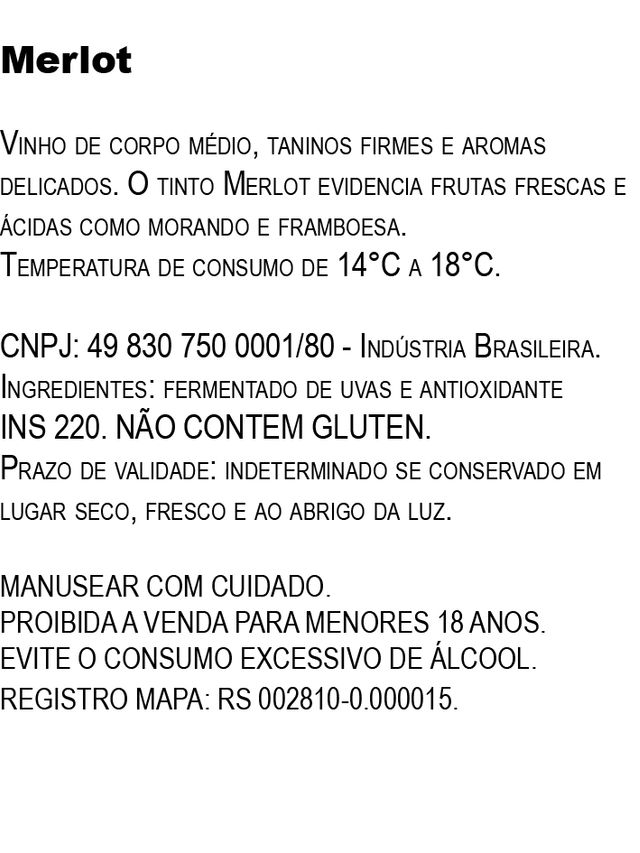 Vinho de corpo médio, taninos firmes e aromas delicados. O tinto Merlot evidencia frutas frescas e ácidas como morando e framboesa.