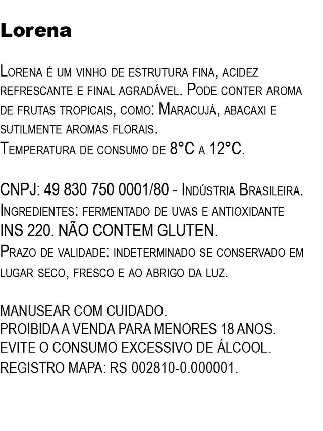 Lorena é um vinho de estrutura fina, acidez refrescante e final agradável. Pode conter aroma de frutas tropicais, Maracujá, abacaxi e sutilmente aromas florais.