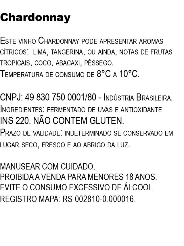 Este vinho Chardonnay pode apresentar aromas cítricos: lima, tangerina, ou ainda, notas de frutas tropicais, coco, abacaxi, pêssego.